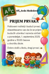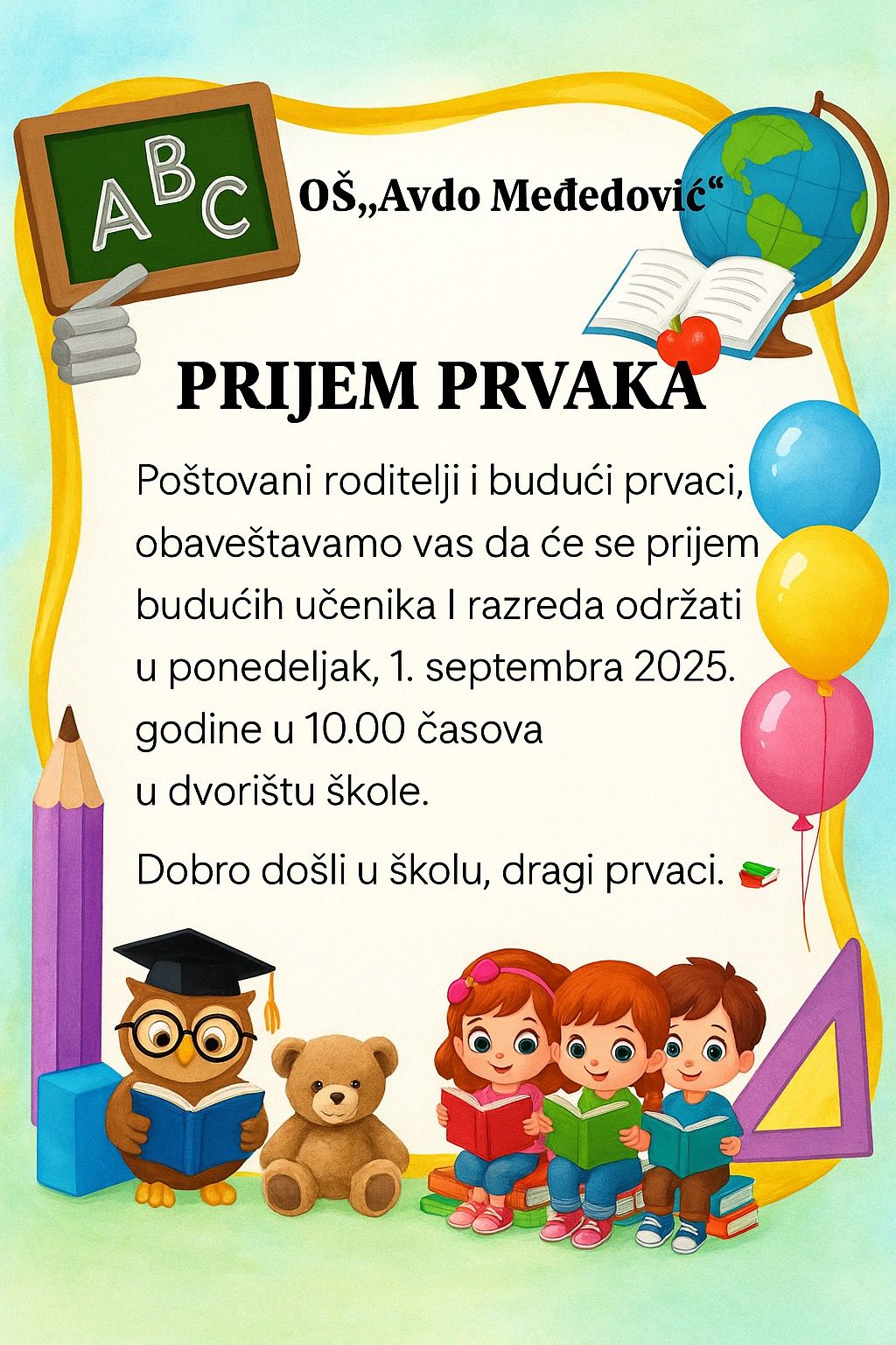 Poštovani roditelji i budući prvaci obaveštavamo vas da će se prijem budućih učenika I razreda održati u ponedeljak 1.septembra 2025.godine u 10.00 časova u dvorištu škole.
